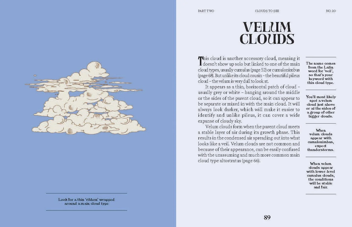 Clouds: A Guide for the Curious by Susan E. Clark is part of Quadrille’s nature series. It’s not quite pocket-sized, but it’s small enough to be considered dinky. Inside are two parts. Part One is all about manifestations of weather, including clouds, of course, but also phenomena such as rainbows, fog, tornadoes and twisters. Part Two spans descriptions and illustrations of 30 different cloud types, each as gorgeous as the next.